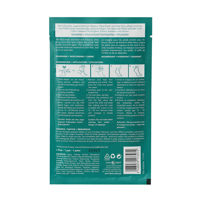 Entdecke mit der Fußmaske von CHIARA AMBRA® eine einzigartige Kombination aus Hibiskus, bekannt für seine hauterneuernden Eigenschaften, Shea Butter, die intensiv Feuchtigkeit spendet und die Hautbarriere stärkt, sowie Aloe Vera, das für seine beruhigende und heilende Wirkung geschätzt wird.