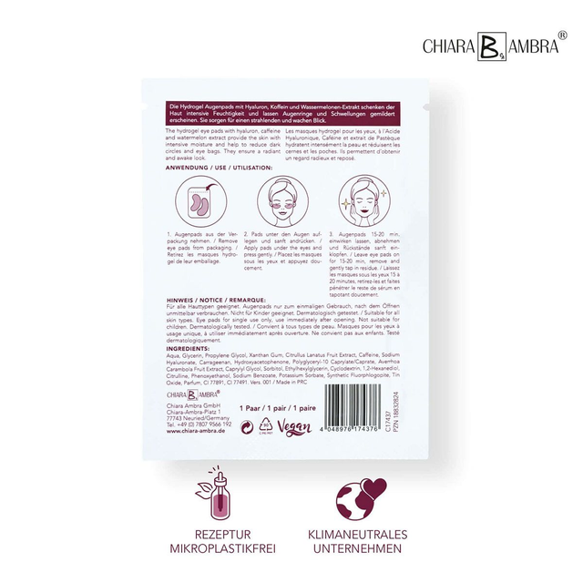 Die Augenmasken vorsichtig von der Hülle entfernen und direkt unter den Augen - auf der gereinigten Haut - positionieren. 15 - 20 Minuten einwirken lassen. Danach die Hydrogel Eye Pads abnehmen und Rückstände einmassieren.